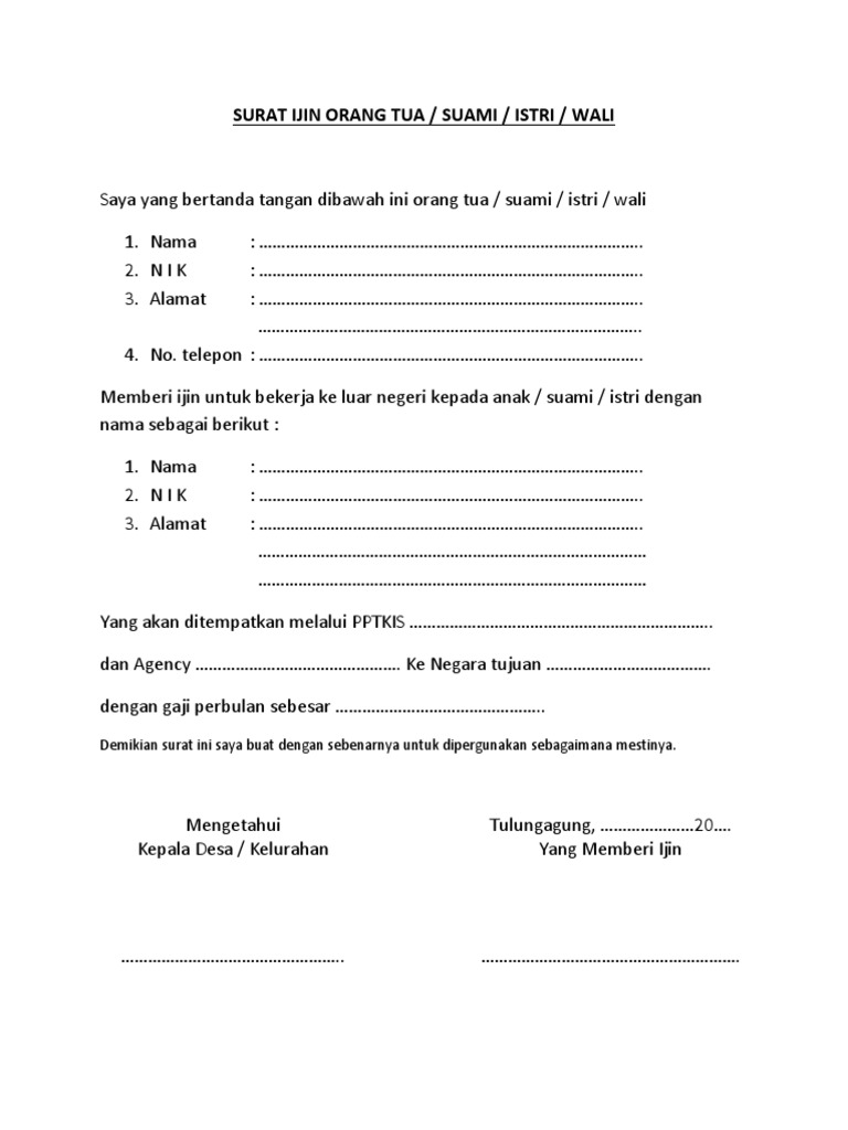 Misalnya, sekolah akan mengeluarkan surat pernyataan bagi orang tua untuk turut berpartisipasi dalam proses perkembangan belajar anaknya di sekolah. Yang bertanda tangan di bawah ini 11 contoh surat izin tidak masuk sekolah dan cuti kerja. Dengan hormat, yang bertanda tangan di bawah ini Surat izin orang tua untuk mengikuti program pemagangan. Atas perhatian dan kerjasamanya kami ucapkan terima kasih. Dalam beberapa kasus, surat izin orang tua kadang juga diperlukan ketika ingin mendaftar kerja di bank tertentu. Maka dari itu, anda bisa download contoh surat izin orang tua doc di bawah ini. Contoh surat izin orang tua untuk lomba pramuka. Contoh surat izin untuk mahasiswa yang berhalangan kuliah di atas dapat disertakan dengan tanda tangan dari pihak terkait, misalnya kepala koperasi. Surat ini juga ditujukan untuk orang yang punya kewenangan untuk membolehkan atau kepada pihak yang bertanggung jawab kepada terlaksananya atau tidaknya izin kita. Contoh surat pernyataan orang tua untuk bekerja di luar negeri. Untuk bekerja di perusahaan yang bapak/ibu pimpin.